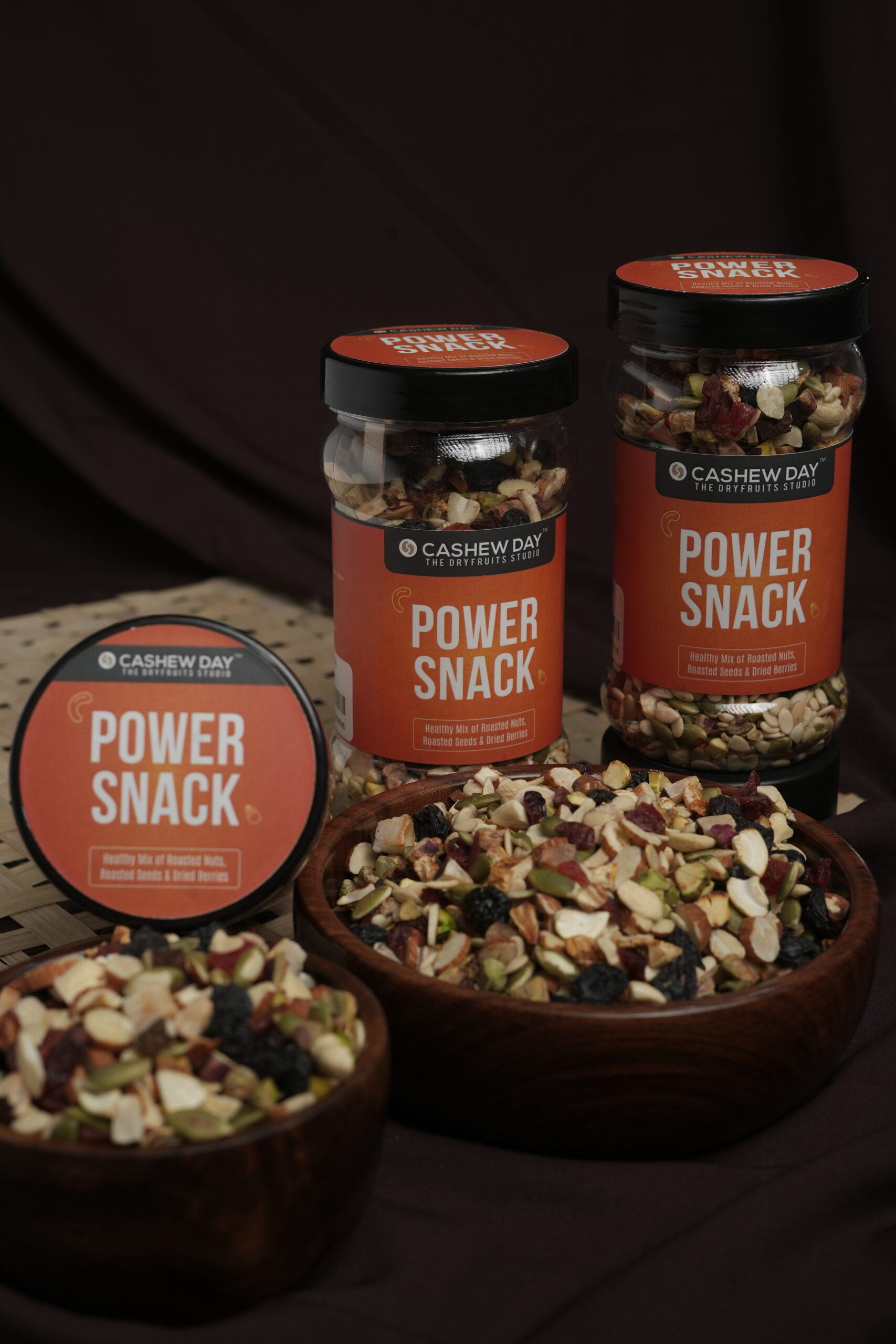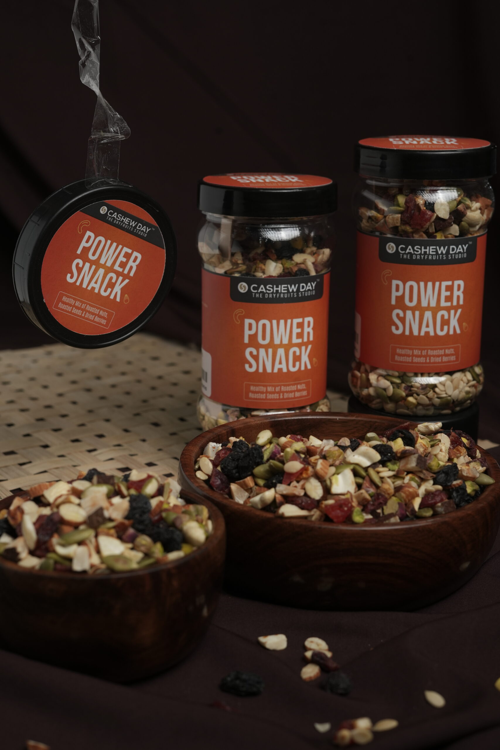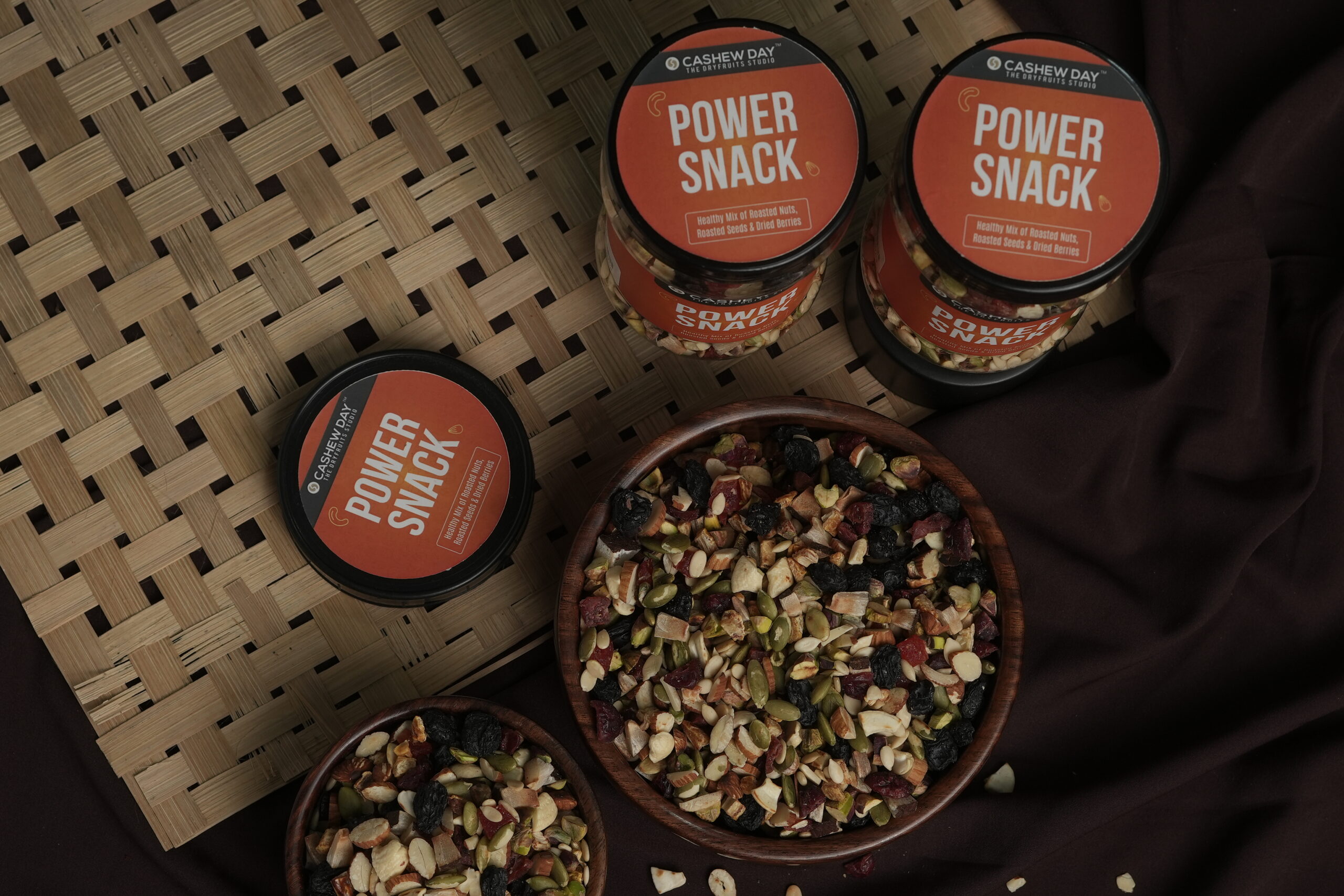 Introducing Power Snack, a premium fusion of roasted seeds, crunchy nuts, and juicy berries – crafted to give you clean, sustained energy throughout the day. What makes it truly special? We cut every nut into uniform pieces to perfectly match the size of the seeds and berries, ensuring even mixing, better texture, and a balanced flavour in every bite.