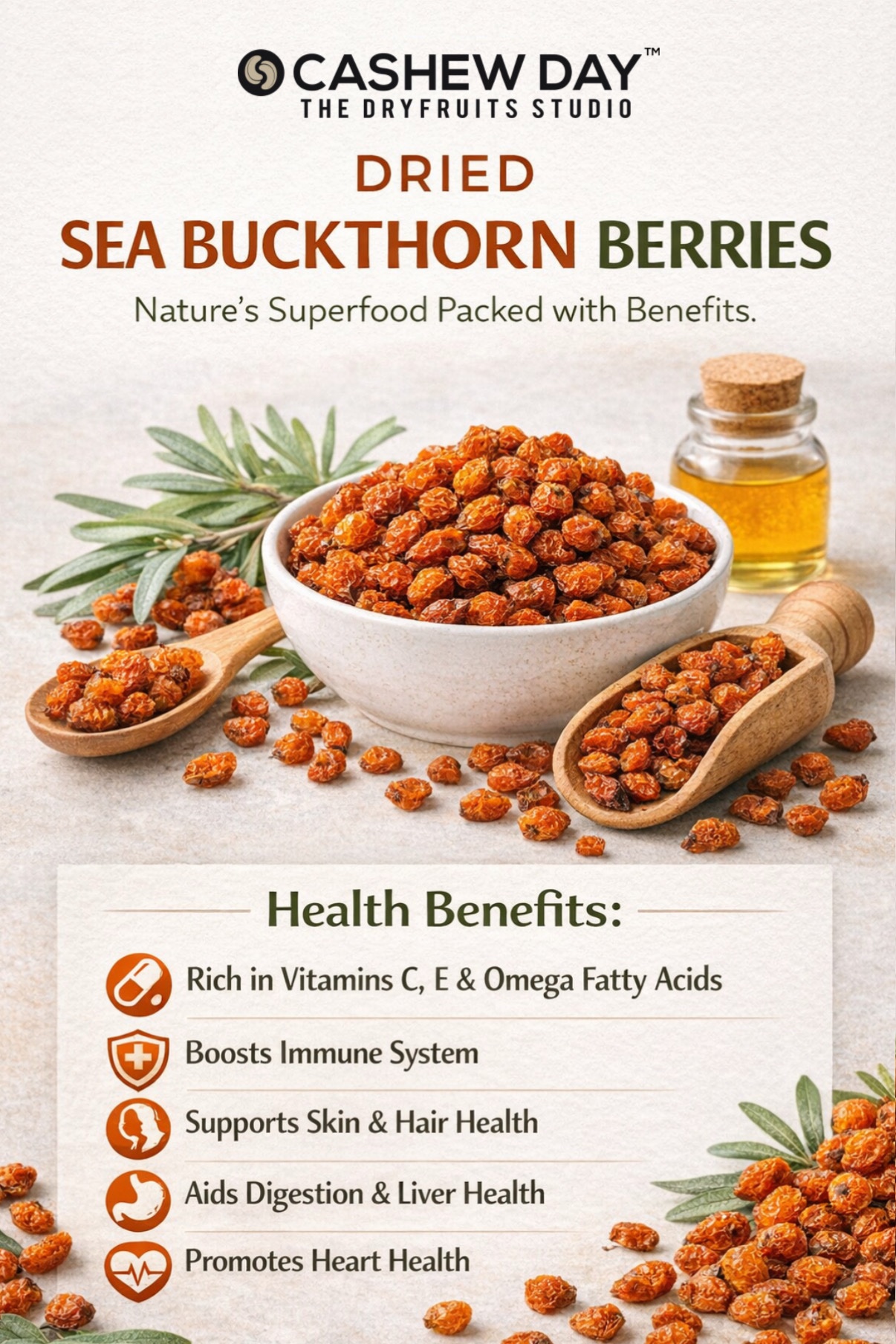 Unlock the ancient secret of high-altitude wellness. Our Dried Raw Sea Buckthorn Berries are sustainably sourced from wild-growing shrubs in pristine environments. Unlike processed powders or diluted juices, our whole dried berries contain the seeds and skin, where the highest concentration of rare Omega-7 oils and antioxidants are found.